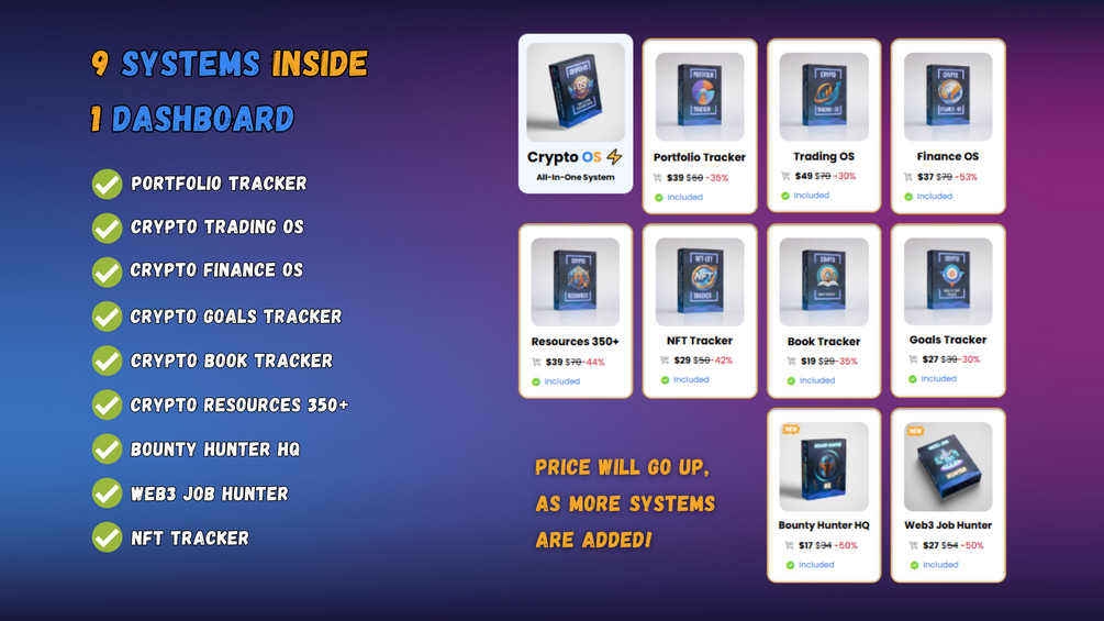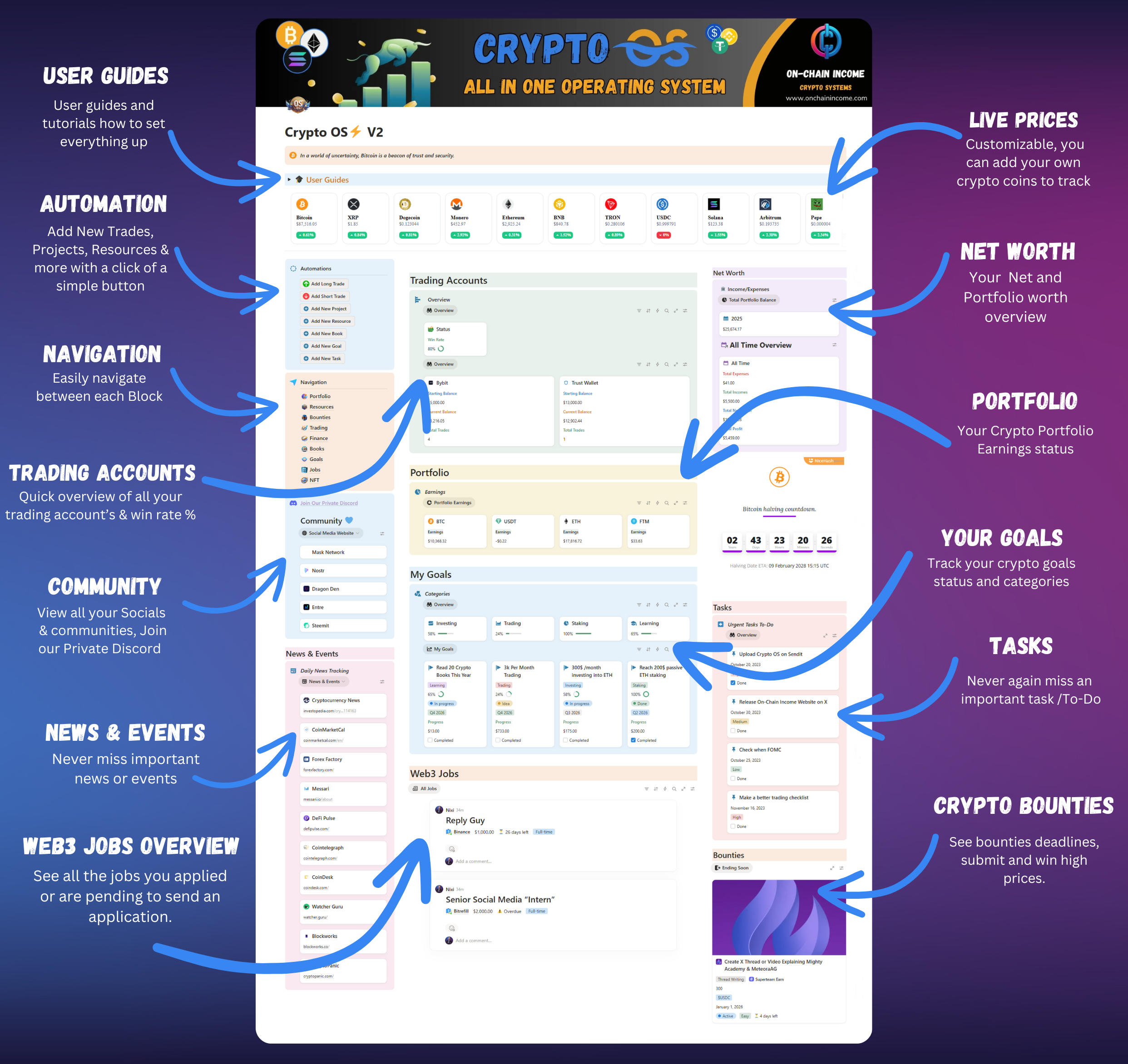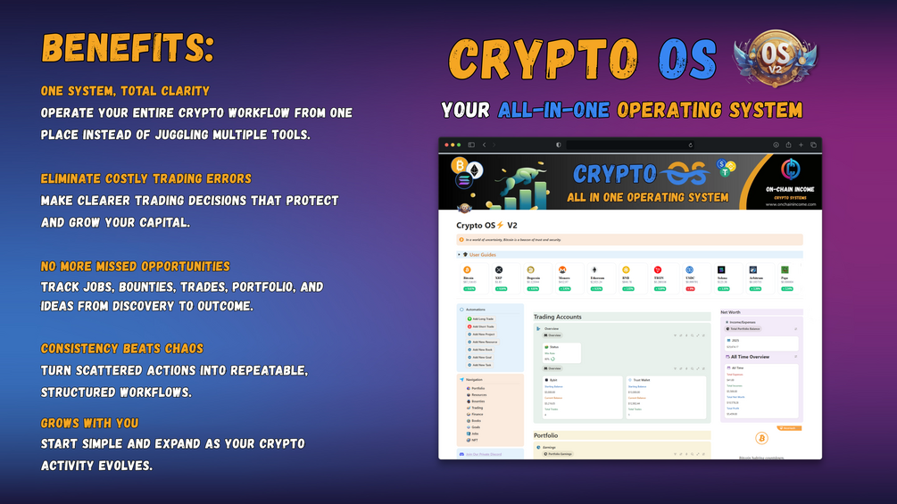 Crypto OS is built around 9 independent systems that work together. You can track and manage your portfolio capital, plan and review trades, organize income and expenses, capture job and bounty opportunities, manage NFTs, and align everything with clear goals, all without jumping between tools.